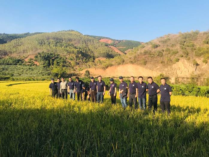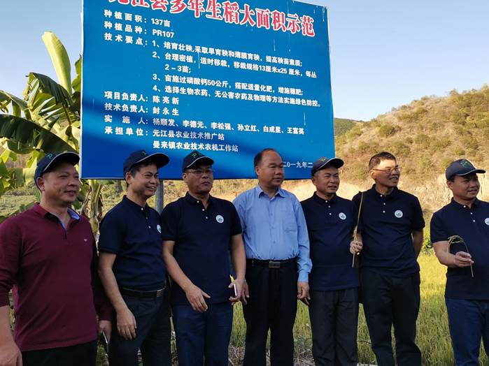 在全国农业技术推广服务中心的组织下,从 2017 年,在南方各省区开展了多年生稻技术的试验示范工作,取得了重要进展,为进一步加快多年生稻技术在贵州和广西两省(区)的试验示范及推广应用。2019年 12 月 16-19日,贵州农业技术推广总站冯泽蔚站长和广西区农业技术推广站宾士友站长组织并带队各省区相关州市农业技术部门及农业企业一行 24 人,现场观摩考察指导云南元江县、勐海县、景洪市多年生稻技术试验示范现场以及云南大学多年生稻技术田间试验示范研究基地。贵州农业厅种植业处靳颖调研员、贵州种子管理站冯世义调研员、广西站李明灌副站长、贵州总站金明副站长、云南省总站道金荣站长、玉溪市农技中心张忠主任、西双版纳农技中心高凡副主任、元江县农技中心陈亮新主任、云南大学胡凤益院长等全程陪同考察。
