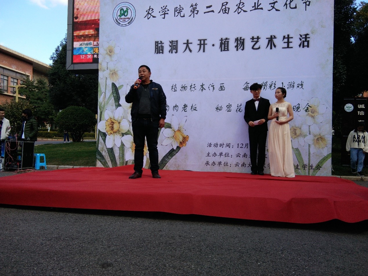 12月11日,农学院第二届“脑洞大开·植物艺术生活”主题农业文化节在知味堂外隆重开幕。云南大学团委书记于春滨老师、农学院党委书记段匡老师、农学院团委书记陈蕊老师、农学院邓纲老师出席开幕式。