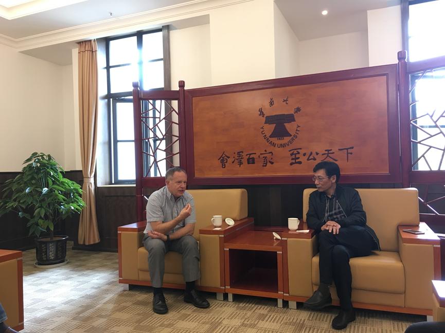 张力副校长介绍了云南大学的发展历史、目标和任务。George Kotch教授介绍了此行的目的以及到新平、宜良等实地考察农学院多年生稻研究工作的情况。