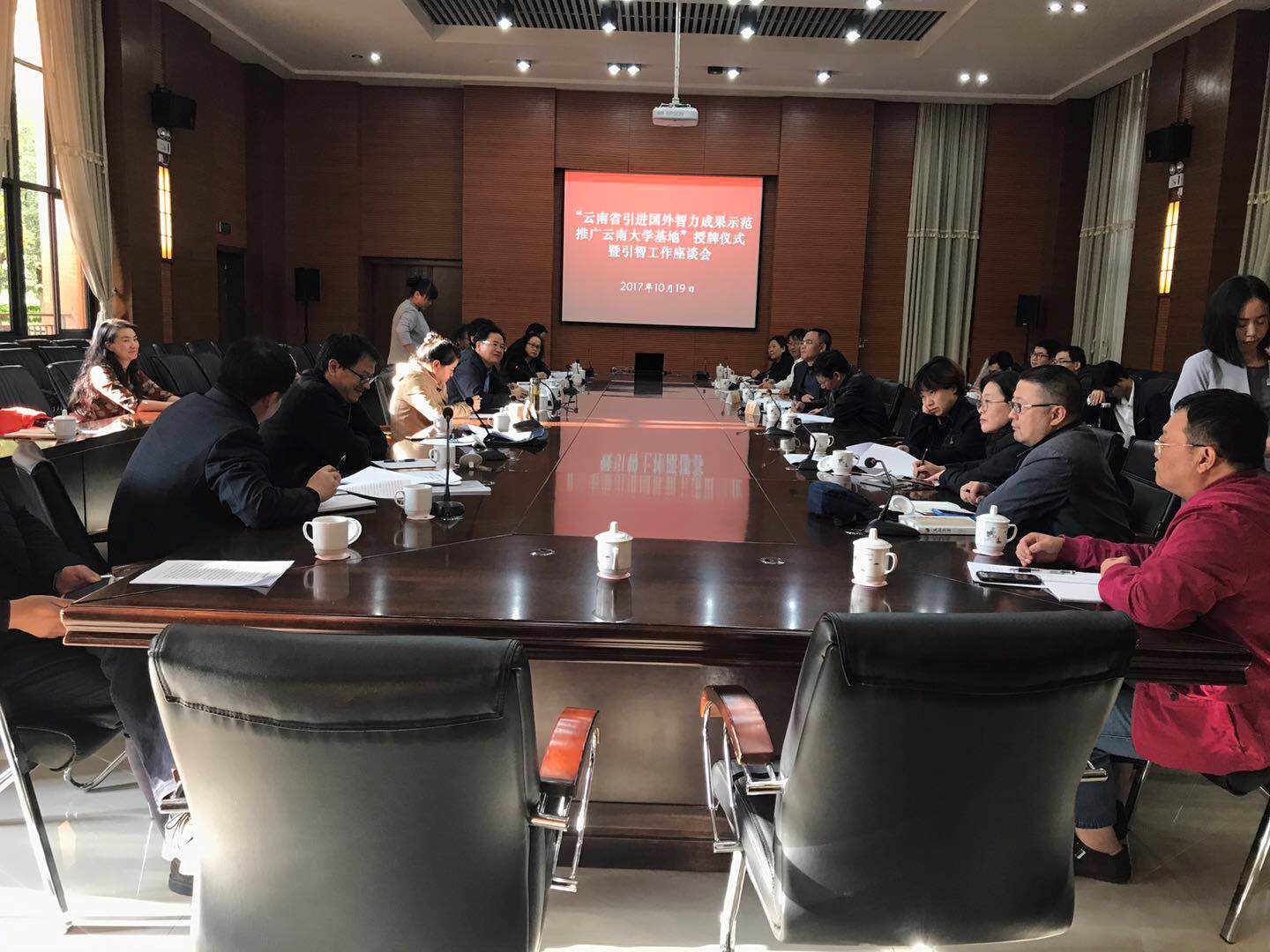2017年10月19日,云南省外专局阮朝奇局长及张明处长莅临云南大学,为云南省引进国外智力成果示范推广云南大学基地--多年生稻技术示范推广引智基地进行授牌。