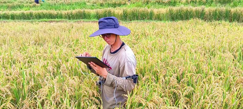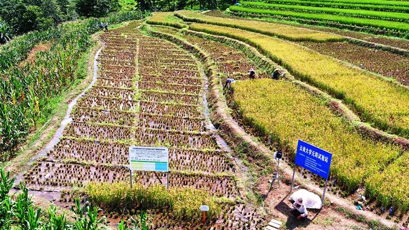梯田里,研究团队人员正用卷尺和测量仪器进行测产,他们介绍说:“第二年第三季的多年生稻‘云大25’产量达到了500公斤”。
