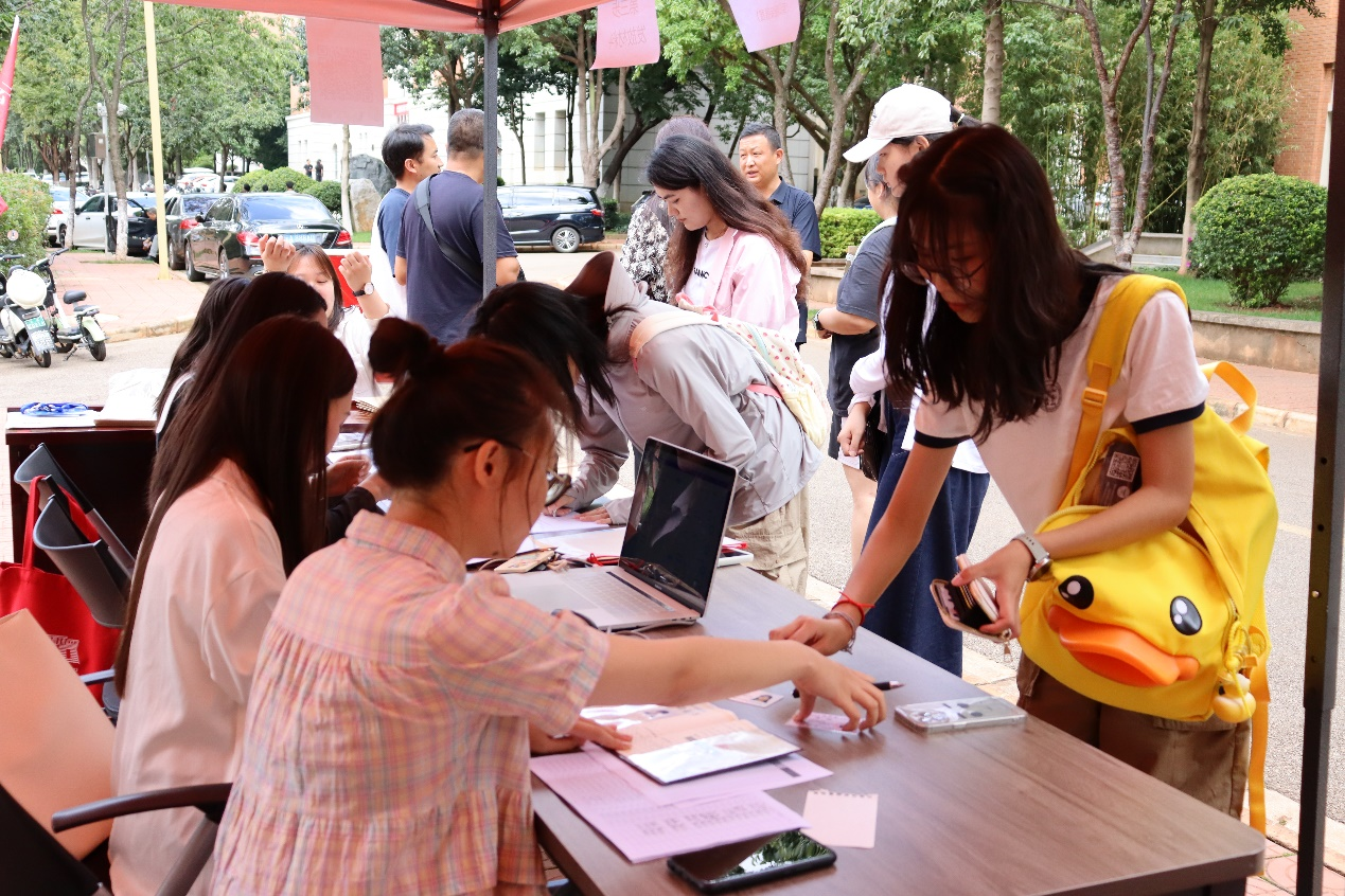 迎新的工作人员仔细核对每一位新同学的报到材料,发放新生指南等资料,为帮助新生们更好地了解和适应新的学习、生活环境,老师和志愿者耐心认真回答着新生的每一个问题,让学生感受到了学院对同学们的关心。