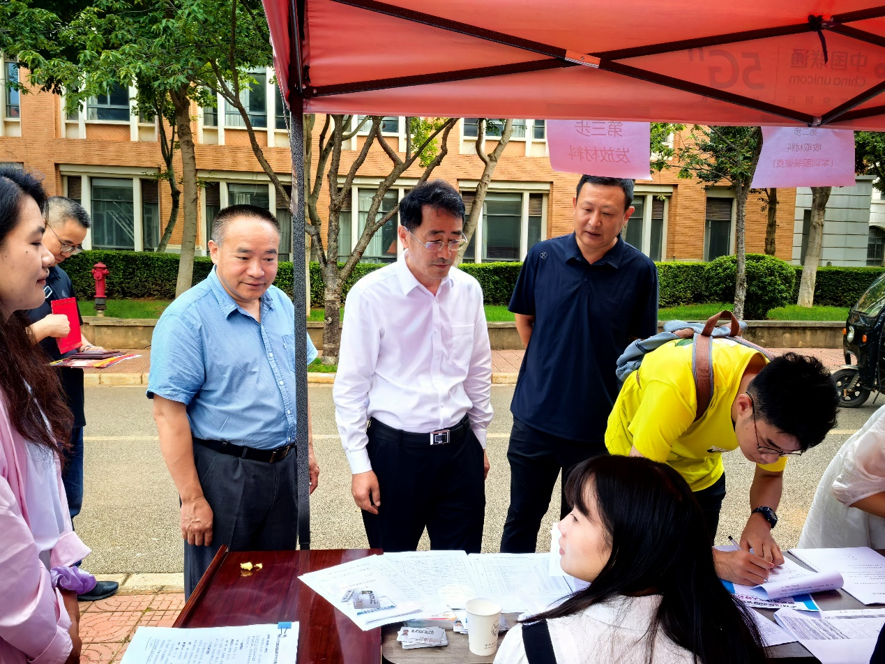新生报到当天学校党委书记周学斌,党委副书记、常务副校长马文会,党委副书记张玮、吴建德等校领导来到学院迎新点欢迎刚入校的新生,与新生及新生家长们亲切交流并看望慰问参加迎新工作的志愿者和师生们。