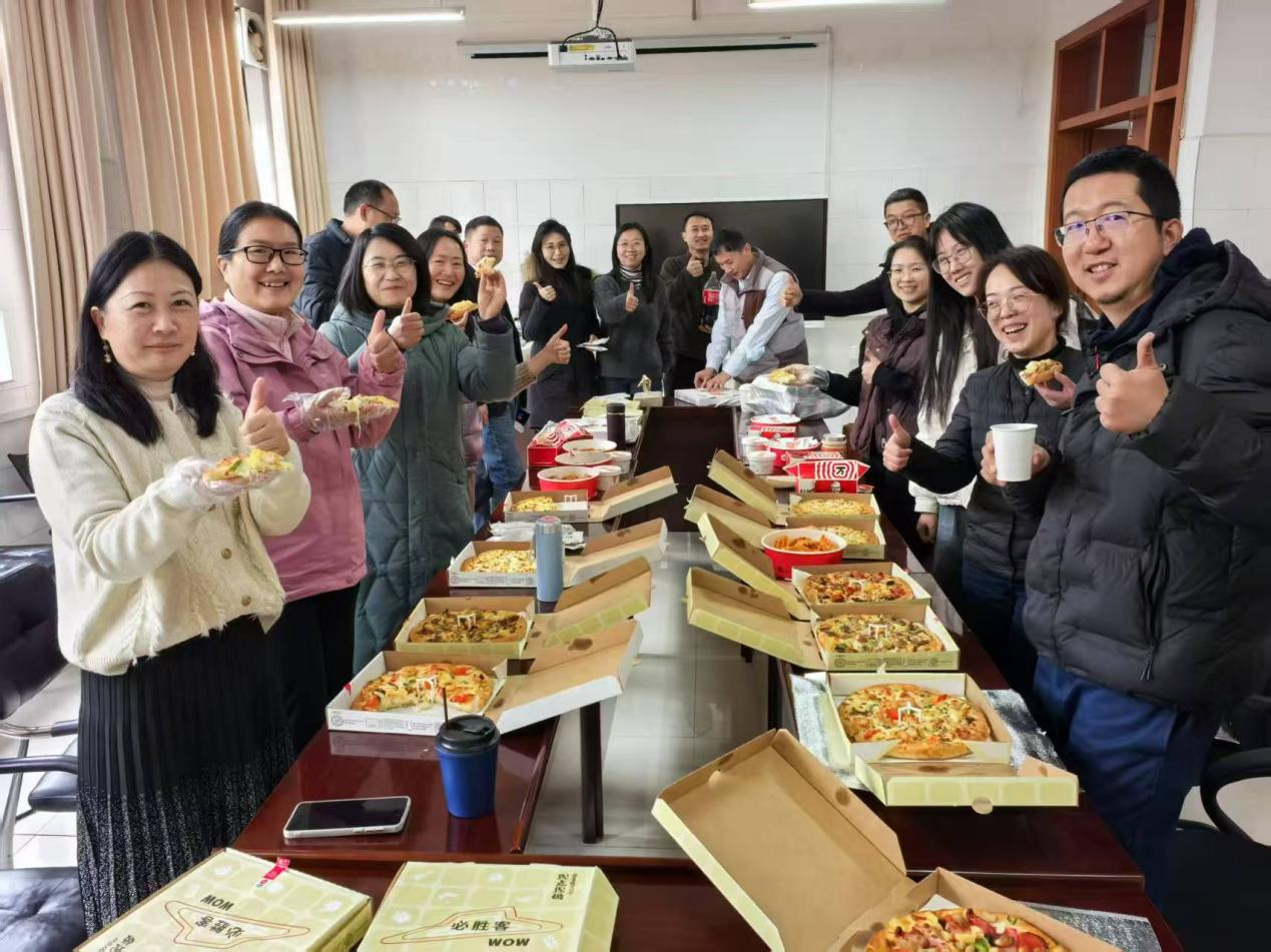 午餐时间,学院为女教师们准备了一场丰盛的披萨午餐会。大家围坐在一起,一边品尝着美味的披萨,一边分享着工作和生活中的趣事。午餐会在轻松愉快的氛围中进行,增进了教师们之间的交流与感情。披萨的香气与欢声笑语交织在一起,构成了一幅温馨和谐的画面。