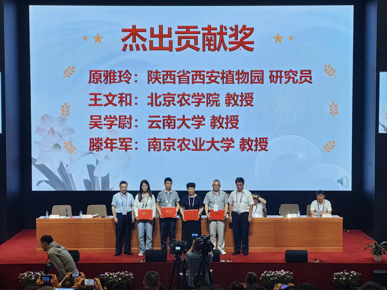 2025年6月20-24日,中国园艺学会球宿根花卉分会2025年学术年会在上海召开,来自全国球宿根花卉领域的272位科技工作者与产业代表齐聚上海,围绕球宿根花卉前沿技术进展与产业升级路径展开深入研讨。2025年是中国园艺学会球宿根花卉分会成立20周年,分会始终秉持深耕产业,推动我国球宿根花卉产业发展。在此次意义非凡的年会上,备受瞩目“终身成就奖”和“杰出贡献奖”的颁奖典礼于6月21日在上海中核科创园会议中心隆重举行。其中,“杰出贡献奖”旨在表彰在观赏球宿根花卉植物研究、产业推动和推进分会工作中取得杰出贡献的学者。经过严格的推选评审流程,原雅玲(陕西省西安植物园 研究员)、王文和(北京农学院 教授)、吴学尉(云南大学 教授)、滕年军(南京农业大学 教授)四位学者荣获这一重要奖项。中国园艺学会球宿根花卉分会名誉会长刘青林教授和中国园艺学会球宿根花卉分会会长张永春作为颁奖嘉宾,为获奖者颁发荣誉,表彰他们在科研道路上的不懈探索与突出贡献,感谢他们为分会做出的贡献。