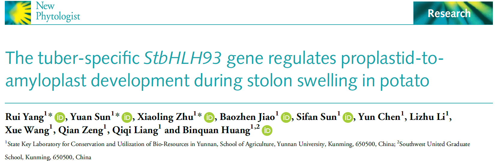 12月04日,云南大学-资源植物研究院/农学院黄斌全课题组在植物科学领域TOP期刊《New Phytologist》(5YIF=10.5)在线发表了题为“The tuber-specific StbHLH93 gene regulates proplastid-to-amyloplast development during stolon swelling in potato”的研究论文,该研究发现了马铃薯块茎形成的新的分子调控机制,首次报道造粉体发育在马铃薯块茎形成过程中的重要的作用。