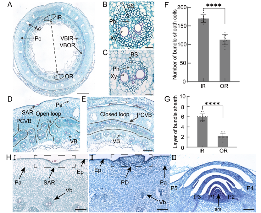 从地下茎组织横切面上观察,地下茎由表皮、薄壁组织、通气组织以及内外两圈维管束组成,地下茎的生长发育包括薄壁组织凹陷、先出叶生成以及地下茎腋芽形成三个阶段2):节间基部横切面薄壁组织出现的凹陷特征是地下茎生长发育的起始阶段,将其定义为阶段I;伴随地下茎的生长发育,薄壁组织凹陷区域生成先出叶,同时与先出叶紧邻的薄壁组织细胞开始分化并在形态结构上更为致密,定义为地下茎发育阶段II;最后,薄壁组织的凹陷区域发育形成地下茎腋芽,包含叶原基和顶端分生组织,定义为阶段III地下茎组织切片完整呈现出不同生长发育阶段结构特性,为探索地下茎生长发育的生物学机制提供了参考。