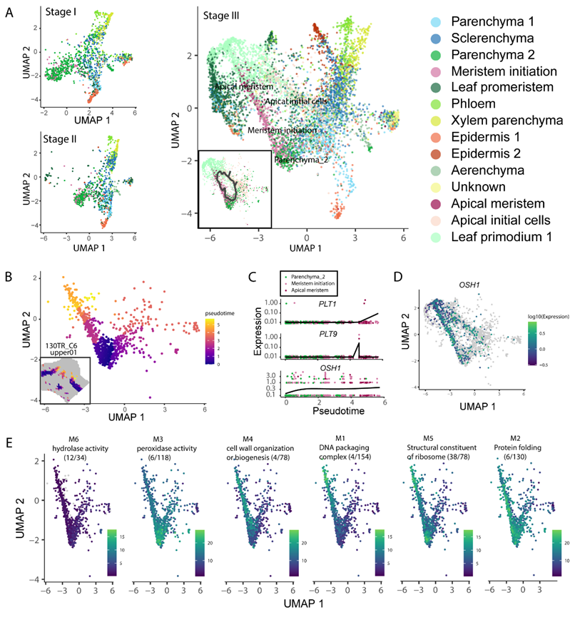 进一步解析地下茎生长发育的细胞生物学过程,发现生长发育阶段III中分生组织起始群与薄壁组织2群重叠,而在第阶段,两群出现分离,并与顶端分生组织群、叶原基1群、顶端起始细胞群和薄壁组织2群形成发育闭环(4)。第III发育阶段包含顶端分生组织细胞群的RNA剪切速率显示出从地下茎顶端到内圈维管束的发育方向,表明在第III阶段地下茎顶端分生组织开始分化为其他类型的细胞群。这些结果表明从顶端分生组织群到顶端起始细胞群的发育顺序,起始细胞群随后分化成薄壁细胞并形成一个完整的发育轨迹。将拟时序结果映射到地下茎对应细胞群的空间位置上发现地下茎顶端附近的分生组织起始位点具有更晚的拟时序,与地下茎生长发育的生物学特性一致。这项研究为长雄野生稻地下茎生长发育的生物学机制解析提供了重要的理论支撑。