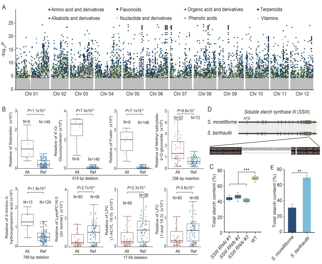 该研究收集了大量的马铃薯优异种质资源,高质量地组装了29个野生材料和地方品种的基因组,结合22个已发表马铃薯基因组数据,构建了马铃薯组的超级泛基因组(图一)。在此基础上,发现194,330个非冗余结构变异(SVs),包括149,344个存在和缺失变异(PAVs),26,305个重复(DUPs), 16,918个易位(TRANSs)和1,763个倒置(INVs),研究表明结构变异显著影响了其相邻基因的表达水平。另外,该研究对248份马铃薯优异的种质资源材料,包括117份野生材料,40份地方种和91份栽培品种,进行了高深度的重测序(25×),发现了25,969 SVs, 11,674,286 InDels和55,190,267 SNPs。为了阐明马铃薯品质形成的遗传分子机制,该研究利用广泛靶向液相色谱-串联质谱(LC-MS/MS)对117个马铃薯野生材料和40个地方种块茎的代谢组进行了分析,共获得1,258种代谢物,通过PAV-mGWAS分析,检测到9,321个与这些代谢物相关的重要遗传位点,这些基因位点为解析马铃薯品质性状遗传分子机制奠定了重要基础(图二)。为了更好地利用马铃薯种质资源的基因信息,该研究构建了马铃薯泛基因组数据库(PPDB),这对马铃薯功能基因组和分子育种研究具有重要意义。