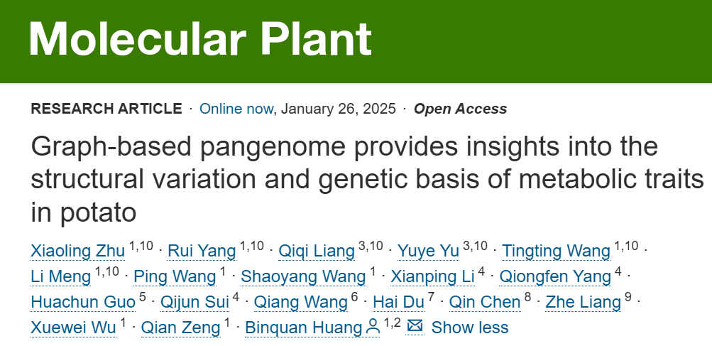 近日,williamhill英国官网黄斌全研究员课题组在植物科学领域TOP期刊Molecular Plant(5年平均影响因子为21.4)在线发表了题为“Graph-based pangenome provides insights into the structural variation and genetic basis of metabolic traits in potato”的研究论文,该研究构建了覆盖整个马铃薯组的泛基因组/图基因组,利用全基因组的结构变异,对马铃薯块茎代谢物进行了全基因组关联分析,发现了系列马铃薯块茎重要代谢物的关键遗传位点。该研究为解析马铃薯品质性状遗传分子机制奠定了重要基础,为进一步的马铃薯品质性状遗传改良提供了理论基础。